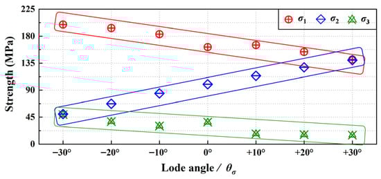 The peak value of σ1 decreases linearly from 198.8 MPa at θσ = −30° to 140.8 MPa at θσ = +30°, accompanied by an increase in σ2 and a decrease in σ3. This trend offers direct guidance for in situ stress management in underground engineering. Higher θσ are typical in tectonically active regions and near fault zones, where load-bearing capacities are lower and collapse risks during excavation are elevated. For instance, in deep-buried caverns susceptible to rock bursts, advance mapping of in situ stress orientations can identify high θσ zones prone to shear-dominated and rapid failure [40]. This observation aligns with theoretical frameworks emphasizing deviatoric invariants. Under higher θσ, elevated deviatoric stress q lowers the threshold for shear localization. Accordingly, reinforced support systems should be implemented to mitigate predicted strength reductions. Furthermore, in hydraulic fracturing operations, drilling modifies the 3D stress field around wellbores. Neglecting θσ variations has led to wellbore collapses, causing economic losses through non-productive time and remediation costs [41].