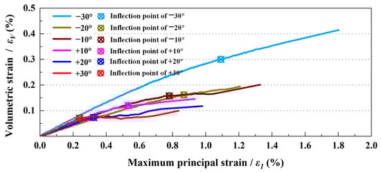 Figure 5 shows the relationship between the maximum principal strain (ε1) and volumetric strain (εv), with colors indicating different θσ values. The ε1-εv curves exhibit a distinct concave-upward nonlinearity, marking a transition from volumetric compaction to dilation during 3D loading. This nonlinear response reflects the intrinsic dilatancy of the rock, in which volumetric expansion increases with accumulated shear strain. The onset of dilatancy is linked to the initiation and subsequent propagation of microfractures within the rock matrix. The primary deformation characteristics of sandstone under 3D stress loading can be summarized in two distinct stages: