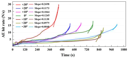 Figure 6 shows the evolution of AE hit rates under different θσ values over loading time. A linear fitting was applied to the sharp-rise stage to determine the corresponding slopes. The AE hit rate, representing the number of AE events per unit time, serves as an indicator of both fracture accumulation rate and proximity to failure. Under all θσ conditions, the AE hit rate increases progressively with loading. However, θσ markedly influences the growth pattern, especially during the sharp-rise (accelerated damage) stage. As θσ increases from −30° to +30°, the AE hit rate exhibits a clearly rise, with slopes increase from approximately 0.0848 to 0.2698. This indicates that higher θσ lead to a more rapid surge in AE activity as rock failure approaches, while lower θσ are associated with a more gradual increase. These slope differences reflect the rate of fracture generation within the rock: steeper slopes correspond to more fractures forming per unit time. When interpreted alongside the ε1-εv curves in Figure 5, it becomes evident that under higher θσ, the volumetric strain inflection point occurs earlier and is more pronounced, suggesting an earlier transition into accelerated failure accompanied by more abrupt fracturing. In contrast, under lower θσ, the inflection point is either unobvious or only appears near rock failure, implying more gradual damage accumulation and a smoother fracture process without a well-defined acceleration stage.