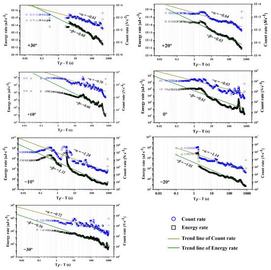 Evolution of AE energy rate and count rate with inverted loading time using logarithmic scales.