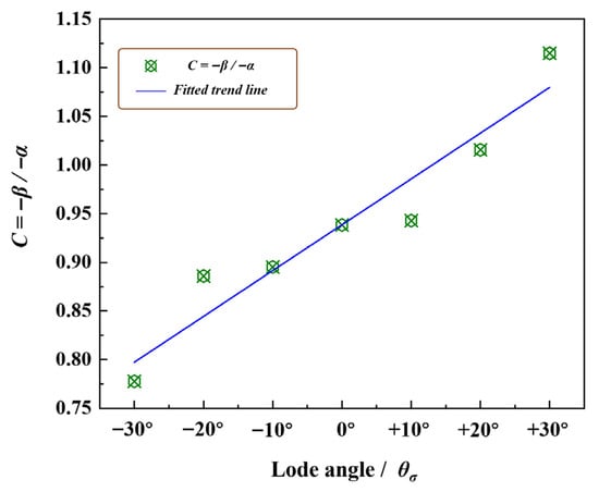 To facilitate a clearer analysis of the AE energy rate and AE hit count rate across the entire data window, normalized coordinate axes were used to plot fitted trend lines (generated by the commercial data analysis software Origin 2024). The corresponding slopes of these trend lines were subsequently extracted. A new parameter denoted as C = −β/−α was then defined, where β and α denote the slopes of the fitted AE energy rate and hit count rate curves, respectively. This parameter C serves as a quantitative real-time indicator of fracturing intensity in rocks under 3D stress. As illustrated in Figure 8, C increases consistently with increasing θσ, indicating enhanced severity of rock failure at higher Lode angles. This trend is consistent with the observations from Figure 4, Figure 5 and Figure 6, further corroborating that elevated θσ promote more abrupt and intense fracture behavior.