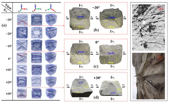 Fracture networks of specimen failure under various θσ; (a) 3D fracture surfaces in different view angles, (b–d) fracture surfaces of θσ = −30°, 0°, +30°, respectively; (e,f) field observations.