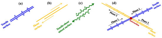 Different classifications of rock fractures; (a) tensile fracture, (b) shear fracture, (c) tensile–shear mixed fracture, (d) deflected shear–tensile hybrid kinked fracture.