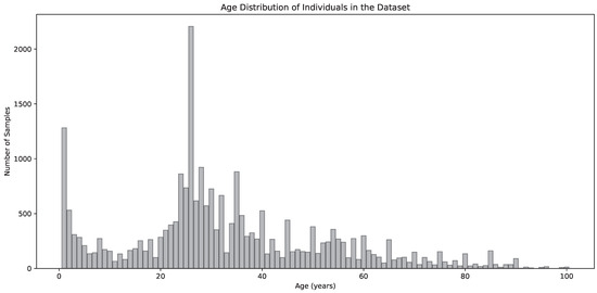 The UTKFace dataset was selected for training the convolutional neural network model [15]. This dataset contains nearly 24,000 facial images and was chosen due to its well-structured organization and the inclusion of essential metadata, namely, age and gender labels assigned to each image. An additional advantage is that the images are already pre-cropped and aligned, minimizing the need for extensive preprocessing. All images are standardized to a resolution of 200 × 200 pixels.