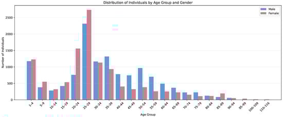 The analysis of these visualizations reveals that the most frequent age group in the dataset is 25–29 years, with age 26 being the most common. A noticeable decrease in frequency begins around the 60–64 age group. The overall gender distribution is relatively balanced, with a minor discrepancy of a few percentage points. However, within individual age groups, the number of individuals of one gender can be up to twice that of the other, particularly in the oldest age groups, where women are significantly overrepresented.