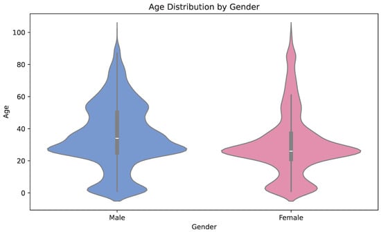 To better understand the dataset’s structure, several visualizations were created. Figure 2 illustrates the overall age distribution of individuals, while Figure 3 shows the distribution of gender across different age groups. Additionally, Figure 4 presents age distribution separately for males and females in the dataset used in this study. The shapes of the distributions reveal differences in both central tendency and dispersion between the two genders. The age distribution for males exhibits a wider range, extending to approximately 90 years. Its density indicates the presence of several peaks, suggesting multiple dominant age clusters, particularly in adulthood and older age groups. The median age for males appears to be significantly higher than that of females. In contrast, the age distribution for females is more concentrated, with most individuals grouped around younger and middle-aged categories. The maximum observed age is lower than in the male group, and the distribution is less uniform, which may indicate overrepresentation in specific age intervals. This characteristic suggests that the model may demonstrate lower precision when estimating the age of elderly female individuals.