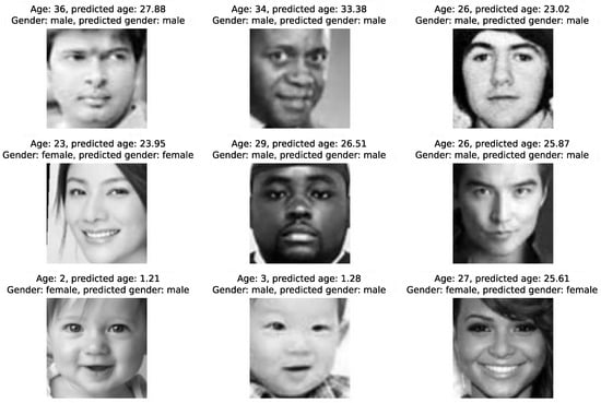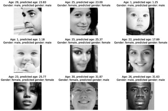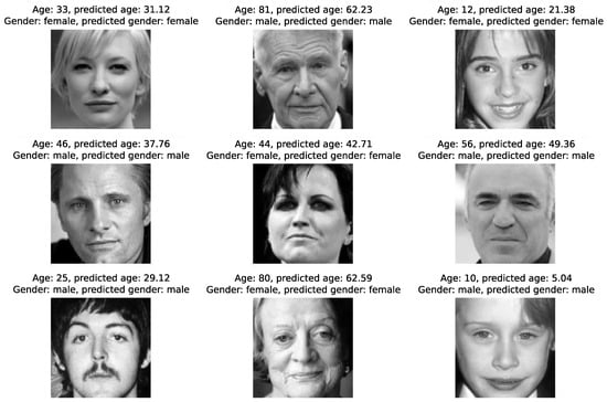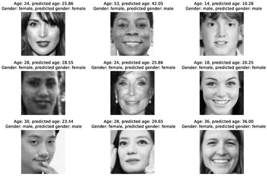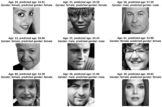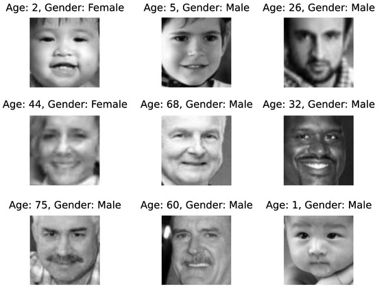 The vectors representing age, gender, and image features were converted into arrays, which improves memory and computational efficiency. The image data were then reshaped into a four-dimensional array with the dimensions (number of samples, height, width, channels). To facilitate the neural network’s learning process, pixel intensity values were normalized to the range [0.0, 1.0]. Figure 5 presents sample preprocessed images along with their corresponding age and gender labels.