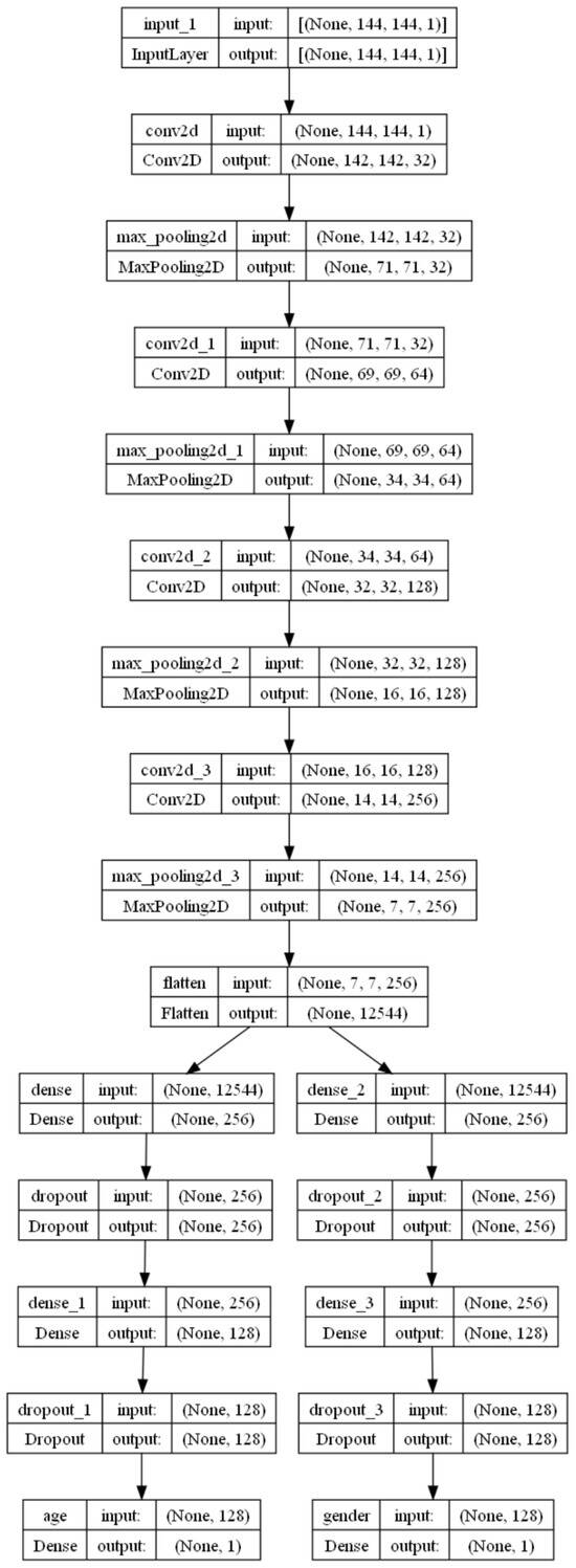 The overall structure of the first model developed for the dual-task learning of age estimation and gender classification is presented in Figure 6. The model processes grayscale facial images of resolution 144 × 144 pixels and consists of a shared convolutional base, followed by two task-specific output branches.