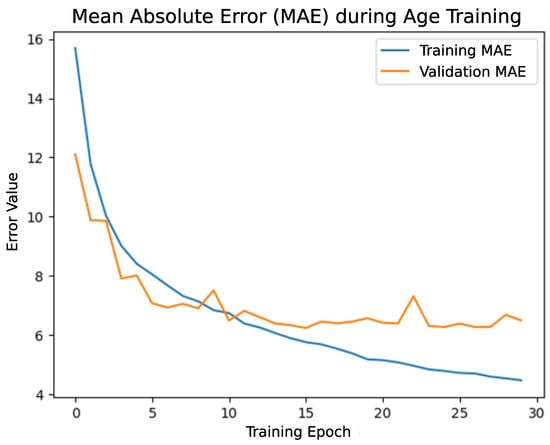 The graphs include the Mean Absolute Error (MAE) for age prediction, the loss function for gender classification, and classification accuracy for gender. Figure 10 illustrates the Mean Absolute Error (MAE) for the age regression task during the training of the third model. A consistent decline in MAE is observed for the training set. For the validation set, the MAE plateaus after epoch 10 and remains relatively stable, suggesting that the model has learned as much as it can from the data.