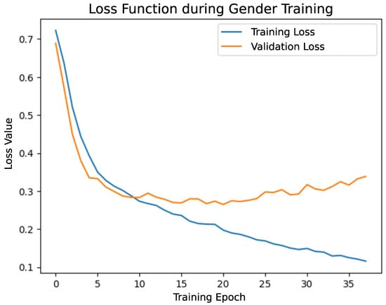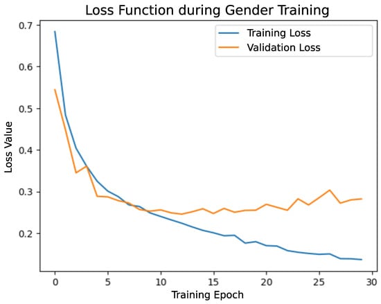 Figure 8 shows the loss function for the gender classification task during training of the first model. While the training loss continuously decreases, the validation loss remains stable before rising in later epochs, a typical sign of overfitting.