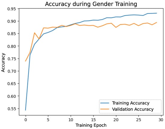 In Figure 9, the classification accuracy for gender prediction is shown. Accuracy improves rapidly for both training and validation datasets in the early epochs. After epoch 10, training accuracy continues to improve, while validation accuracy flattens, further confirming signs of overfitting.