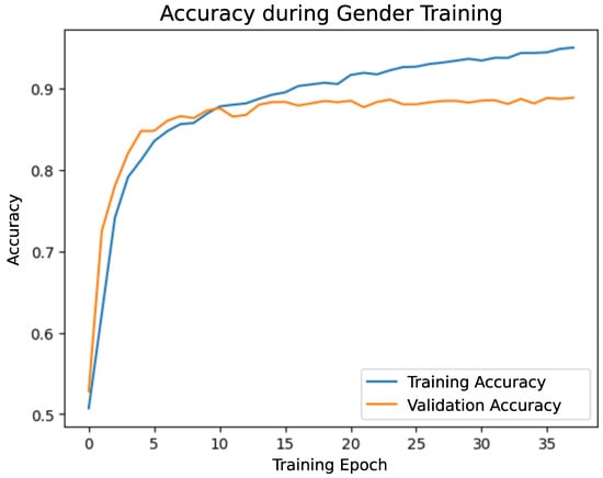 Loss function values for the gender classification task during training of the third model are shown in Figure 11. While the training loss continues to decrease, the validation loss reaches a minimum and then slightly increases, a typical indicator of overfitting, which is effectively managed here through early stopping. Figure 12 shows the accuracy of gender classification. The training accuracy steadily improves, while the validation accuracy stabilizes around epoch 15–20. This consistency across epochs confirms that the model generalizes reasonably well and benefits from the applied regularization strategy.