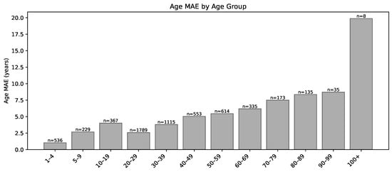 For age estimation, the opposite trend is observed—the model achieves the lowest Mean Absolute Error (MAE) in the youngest age group (1–4 years), where age estimation is most accurate. As age increases, MAE steadily grows, reaching its peak in the senior groups. In particular, for the 90–99 and 100+ age groups, MAE exceeds 8 and 19 years, respectively, indicating very low prediction precision. This may be due to the natural convergence of physical features in older individuals and insufficient representation of these age groups in the validation dataset.