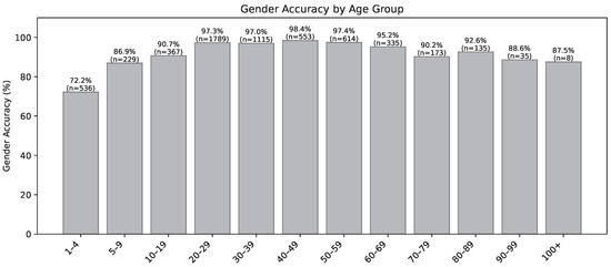 Figure 13 and Figure 14 complement Table 4 by visualizing per-age-group performance. Bars are annotated with the number of test images (n) to make class imbalance explicit. Performance degrades toward the distribution tails (70–79 and older), while gender accuracy peaks in mid-age groups (≈40–59) and drops for the youngest and oldest bins. Results for 90–99 and 100+ should be interpreted with caution due to the limited number of samples.
