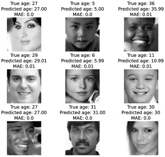 On the other hand, the best prediction results (Figure 15) primarily involve young and middle-aged individuals, most of them under the age of 40. This is likely due to a larger number of training and validation examples in these age ranges, which improves the model’s learning. Moreover, in younger individuals, visual age cues are more consistently aligned with their actual age, making predictions more reliable and resulting in smaller absolute errors—some even as low as zero. These findings highlight the importance of balanced dataset distribution across age groups and point to inherent limitations in modeling human aging from facial features alone, especially in the elderly population.