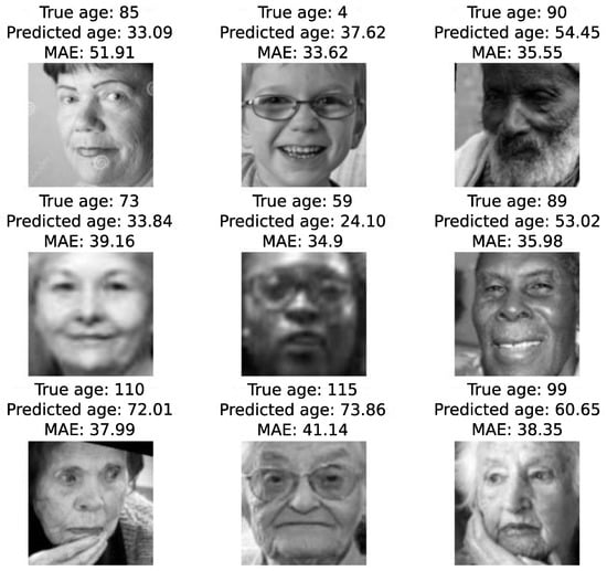 Figure 15 presents a collection of facial images for which the model achieved the most accurate age predictions, characterized by the lowest MAE values. Figure 16 shows images with the least accurate age predictions, where the model’s estimation significantly deviated from the actual age.