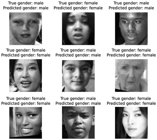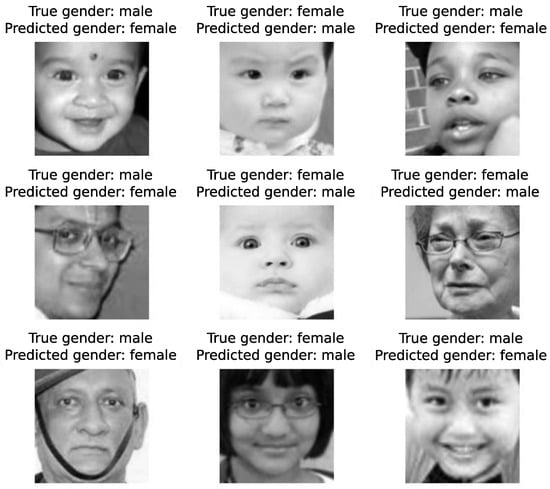 Figure 17 presents example images with correctly predicted gender, while Figure 18 shows cases where gender was misclassified. Based on Figure 18, which displays incorrect gender predictions, a noticeable number of images depict very young children. This observation aligns with real-life experience, where determining the gender of toddlers is often more difficult than for individuals in other age groups. Although the sample size presented in these figures is relatively small, the observations are consistent with the results summarized in Table 4.