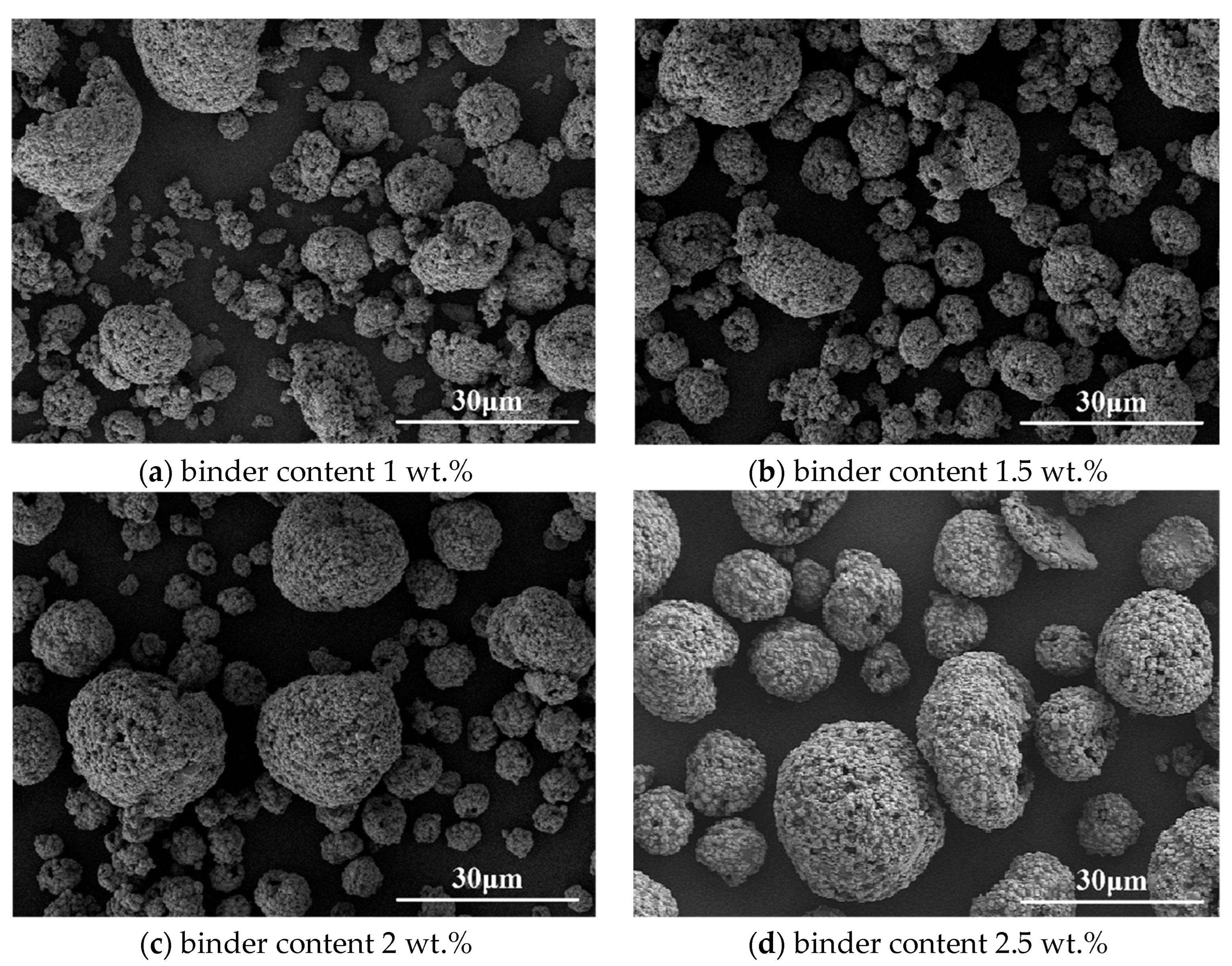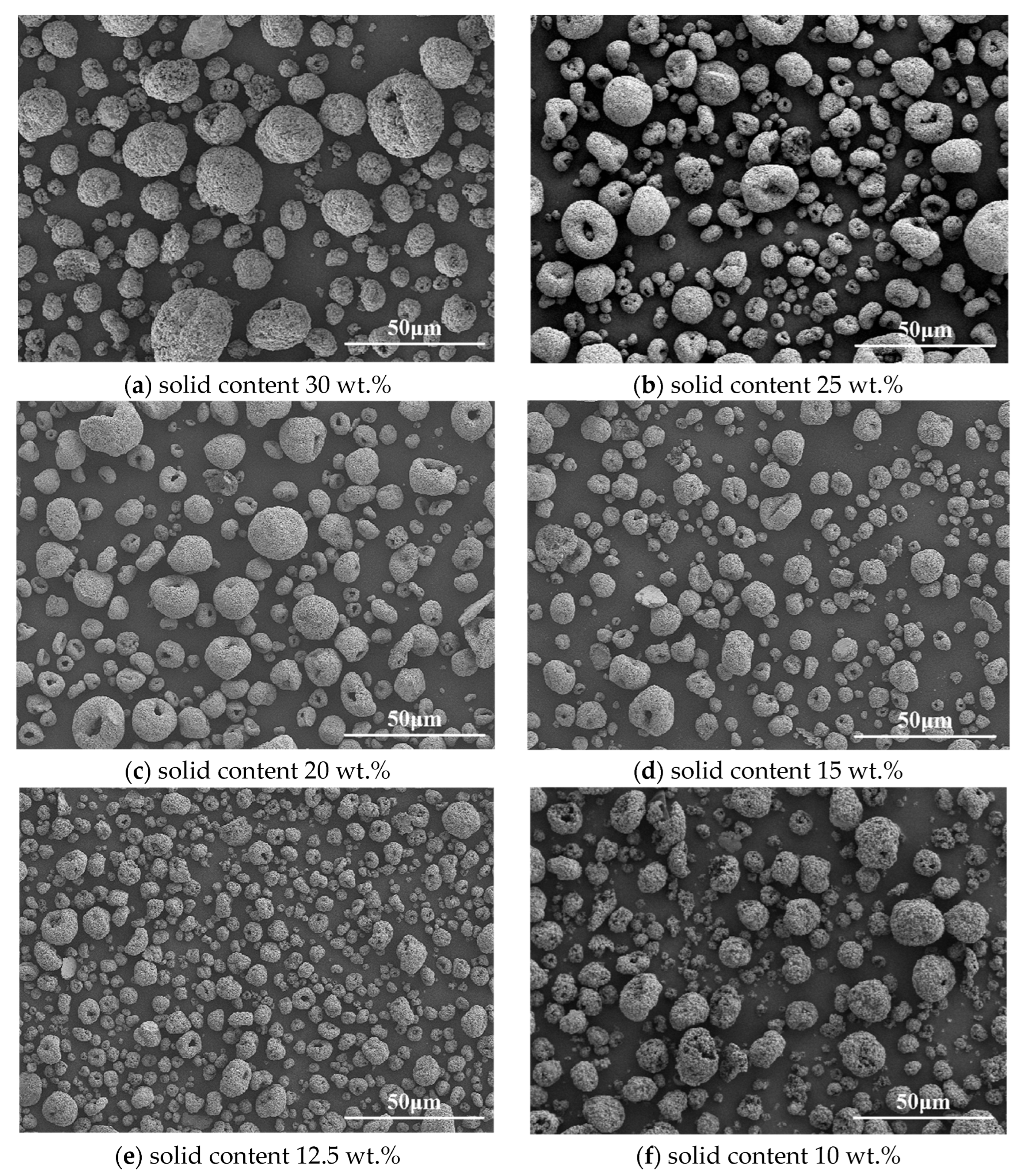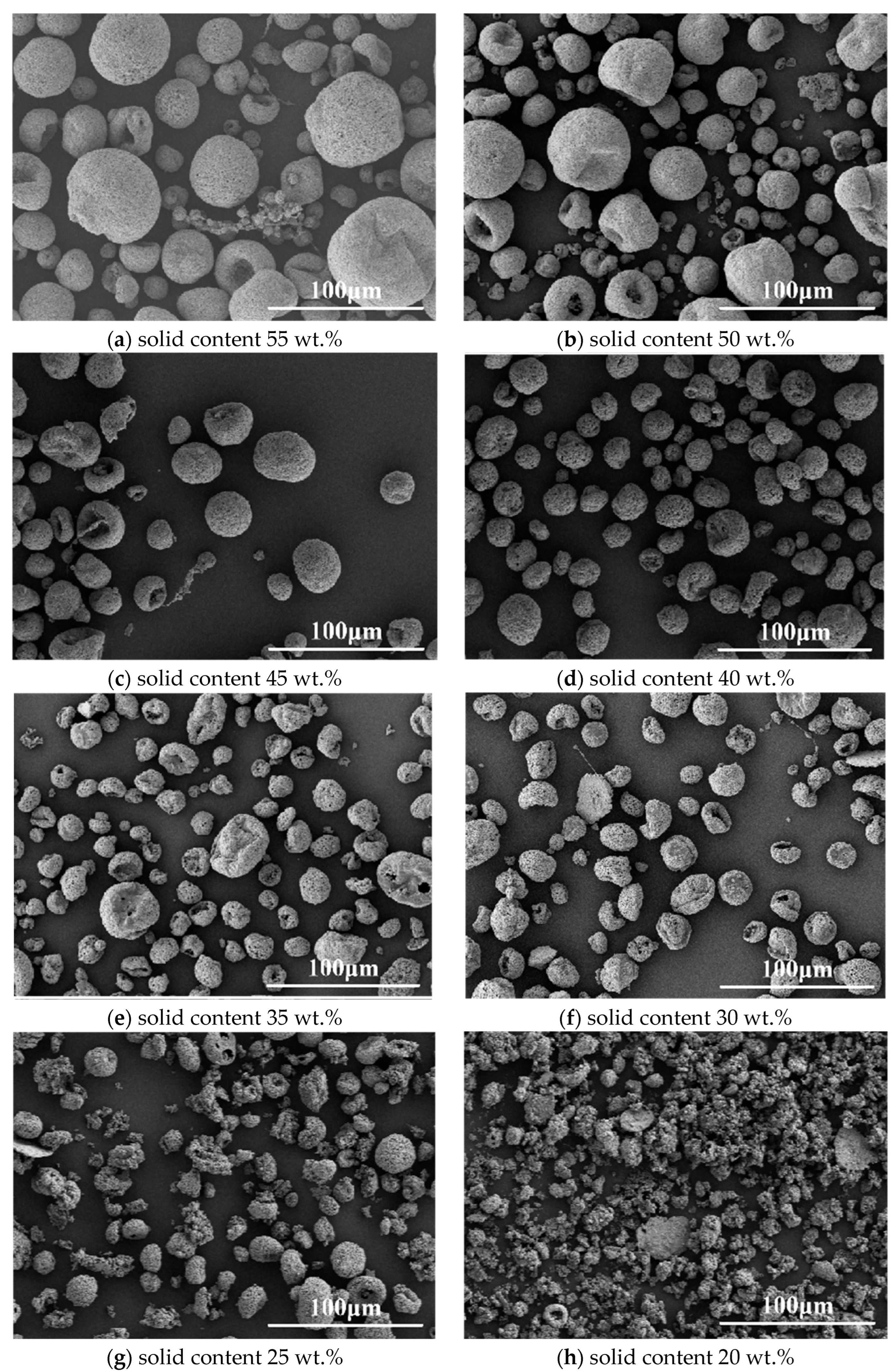3.1. Effect of Solid Content of Pre-Sprayed Slurry on Powder