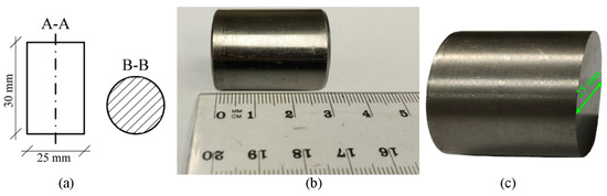 The subject of the research was samples made of EN C45 (1.0503) structural steel (Murray Steel Products, Sheffield, South Yorkshire, UK), which is mainly used for the production of medium-duty machine and equipment components in the automotive industry, as well as for die forging and hot rolling of products such as bars, sheets, and wires. The samples were made in the form of cylinders with a diameter of 25 mm and a height of 30 mm. All samples were cut from EN C45 steel bars and then ground and polished to obtain a uniform surface. Prior to testing, the sample surfaces were cleaned and degreased with technical alcohol to minimize the influence of surface defects on crack initiation and propagation. Two series of samples were made, with 5 pieces in each (Figure 3).