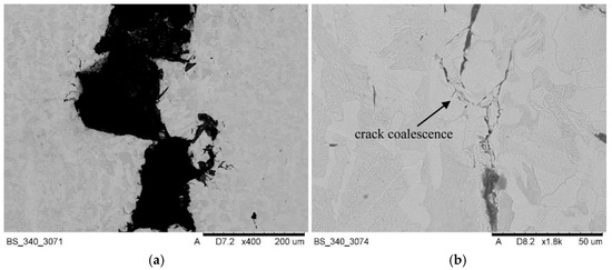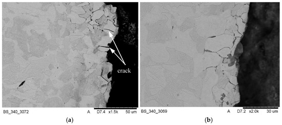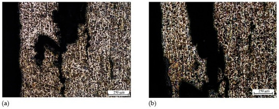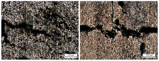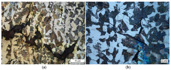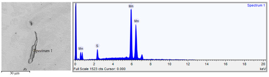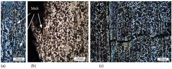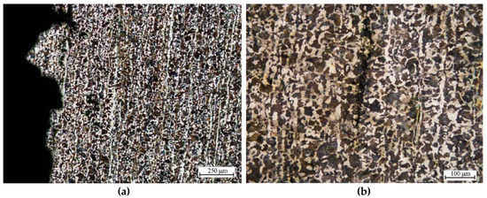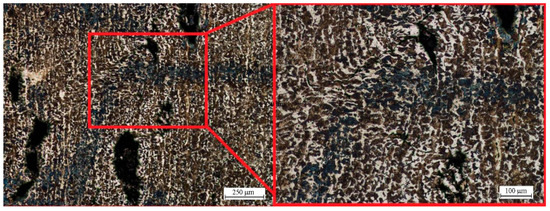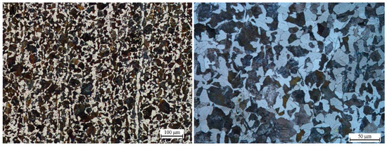 As noted (Figure 4), the material contains a banded ferrite–pearlite structure, characteristic of structural steel in its normalized state. The arrangement of individual grains is striped. The banding of the structure is the result of crystallization with a local excess or deficiency of alloying elements. Areas with low manganese content turn into ferrite earlier. Due to the limited solubility of carbon in ferrite (up to 0.0218%), the excess of this element is pushed into the austenite until it is transformed into pearlite (temp. A1) [49,50].