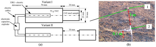 Test stand and its elements: (a) variants of arrangement of the high-energy charge and cylinder samples and (b) training ground for recording the physical-chemical phenomenon, 1—high-energy system and 2—free-wave pressure sensor PCB 137A23. The red arrows indicate the distance between the sample and the sensor (5 m) as well as the sensor’s height above the ground surface (0.1 m).
