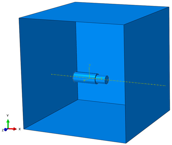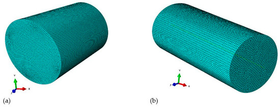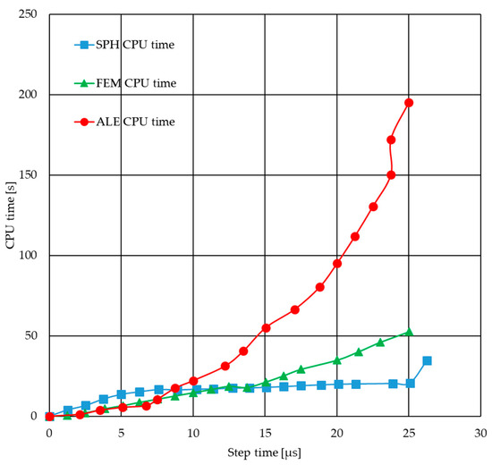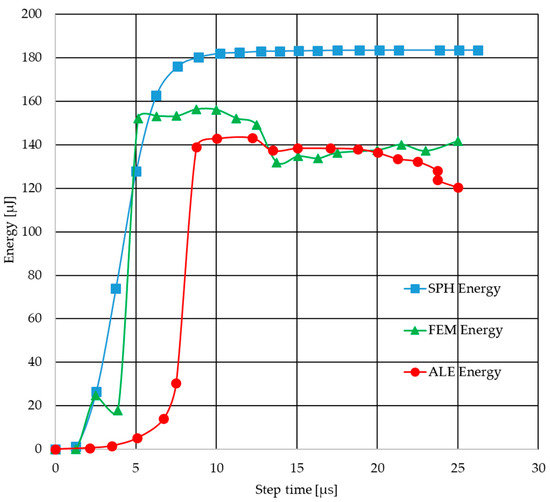 The numerical analysis was performed in the ABAQUS/Explicit program. The tested system was modeled as volume elements. Three methods for modeling a high-energy were used. The first one is standard FEM, the second one is SPH (smoothed particles hydrodynamics), and CEL (coupled Eulerian–Lagrangian)—a method combining Euler’s and Lagrange’s descriptions. The table below lists the elements used in the simulations and presents the type of elements used in the discretization process (Table 3). Below (Figure 6) are shown the discretized roller and materials in an ABAQUS computing environment.