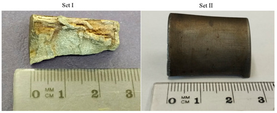 Preliminary inspection of the analyzed research material confirmed damage in each of the cylindrical samples, both series I and series II (Figure 8).