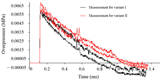 As a result of detonation, the samples from series I were completely fragmented, with cracks concentrated in the sample axis and their propagation along planes extending radially from the interior to the external surfaces. After this plane, the samples were separated into three to five separate fragments. In samples of series II, as a result of the lower energy of the shock wave caused by the distance of the charge from the front of the samples, their deformation occurred mainly with a significant increase in the diameter of the sample front on the detonation side. No cracks were observed on the external surfaces of the samples. As a result of detonation, the samples swelled permanently, as a result of which their height decreased by 14–17% in samples of series I and by 7–8% in samples of series II. The pressure that affected the sample material due to different distances of the samples from the high energy (Figure 5a) had a significant impact on the destruction of the material. Based on the recorded overpressure curves of the free blast phenomenon wave (Figure 9), it is noted that, in the case of direct contact of the analyzed EN C45 steel sample, the pressure decreases significantly after approximately 0.4 ms, which proves that part of the pressure was used up the work that was needed to destroy the sample (black course). For the sample that was characterized only by barreling (red color course), the pressure waveform values are higher.
