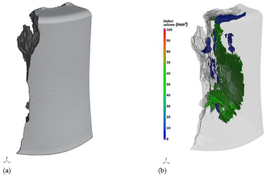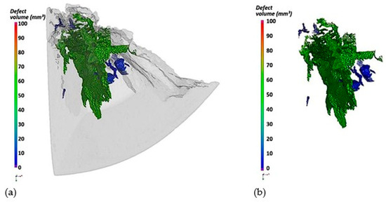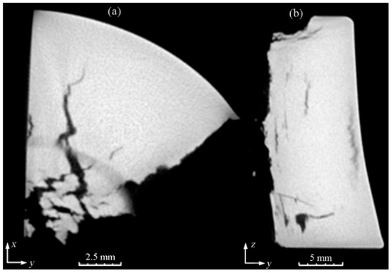 Reconstruction tests were performed on one of the fragments of the sample from series I. The reconstruction was performed using the technical method of computed tomography (CT), which allows for the creation of a three-dimensional model of the distribution of discontinuities [65]. The reconstruction was performed using a CT system equipped with a focused microbeam X-ray tube with a tungsten target, a maximum acceleration voltage of 225 kV, and a minimum focal spot of 7 µm. A flat 16-bit detector with a 1024 × 1024 pixel matrix and a single pixel size of 400 µm was used. The X-ray tube generates a conical beam with a beam angle of 15.5°, and the distance from the radiation source to the detector is 1501 mm. The reconstruction was performed with a voxel size (resolution) of 35 µm. The parameters used in the examination of sample I are presented below (Table 5).