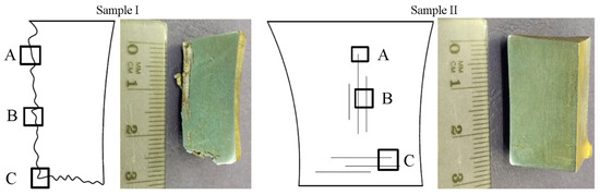 - Both series of samples showed a similar damage mechanism caused by the dynamic impact of the high-energy material. In series I, the direct load led to immediate breakage, while in series II, the samples remained intact but showed numerous internal cracks and deformations. Microscopic observations confirmed that these damages would ultimately lead to complete breakage under higher impulse loads, which is consistent with the behavior observed in series I.