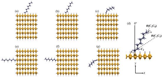 - Buonocore, F.; Marchio, S.; Giusepponi, S.; Celino, M. Computational Insights into the Energetics of Single C2–C10 Aliphatic Moieties Adsorbed on the Hydrogenated Silicon (111) Surface. Langmuir 2025, 41, 9706–9715. [Google Scholar] [CrossRef]