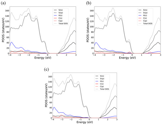 Projected electron density of states (PDOS) of aliphatic C8 moieties: (a) alkyl-SiNW:H; (b) 1-alkenyl-SiNW:H; (c) 1-alkynyl-SiNW:H systems.