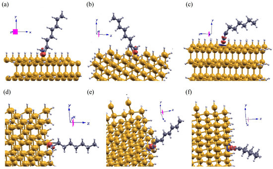 A general trend emerges: the amount of charge transferred increases with the bond order of the carbon–carbon bond closest to the surface. This is attributed to the increased electron localization associated with higher bond orders, as illustrated by the charge density difference plots in Figure 4 (see also Supplementary Materials). These plots show an accumulation of electronic charge along the Si–C bond and over the carbon atom directly bonded to silicon. Simultaneously, we observe charge depletion around the silicon atom and near the bond edge of the nearby carbon atom. Additional, though less pronounced, charge redistribution is also visible along the C–C bonds near the Si–C interface. In particular, the 1-alkynyl moiety exhibits a more substantial accumulation of negative charge around the triple bond closest to the surface.