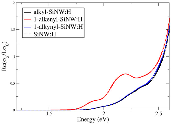 The mesh of k-points 96 × 1 × 1 has been chosen to guarantee well converged optical spectra. The real part of the optical conductivity provides direct insight into the optical absorption characteristics of the system. It quantifies the material’s ability to absorb electromagnetic radiation at different photon energies. Peaks in the real part of the optical conductivity spectrum correspond to allowed electronic transitions between occupied and unoccupied states, and their intensity reflects the strength of these transitions. Therefore, analyzing this quantity allows us to identify the energy ranges where the system is optically active and to assess how different surface functionalization modifies the absorption profile of the SiNW.