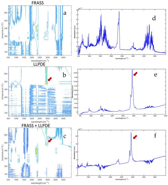 FTIR spectra obtained during the thermal analysis under oxidizing atmosphere. The left panels (a–c) show full-range spectra for frass, frass with 10% LLDPE, and pure LLDPE. The right panels display corresponding spectra at 483 °C (d–f). Red arrows indicate the characteristic C–H stretching bands of methyl and methylene groups at 2928 cm−1 and 2855 cm−1, associated with the decomposition of LLDPE.
