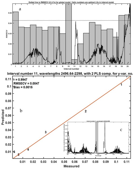 The full spectral dataset was partitioned into calibration and independent test sets. During model development, segmented cross-validation (“syst123”, Venetian blinds) with 5 folds was applied to avoid overfitting and guide latent variable (LV) selection. For each PLS submodel (global or interval-specific), the optimal number of LVs (up to 10) was determined by minimizing the Root Mean Square Error of Cross-Validation (RMSECV). Model performance was evaluated using RMSECV (internal validation), RMSEP (external prediction on the test set), Pearson correlation coefficient (r), and Bias. The spectral range was divided into 10, 20 or 40 contiguous intervals; those intervals yielding lower RMSECV than the global PLS model were selected for final model construction [,]. Visualization and comparison of interval performance were performed using the iplsplot function (iToolbox).