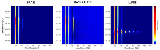 Mass spectra of evolved gases obtained during thermal decomposition under oxidizing atmosphere (N2/O2) for pure frass, frass with 10% LLDPE, and pure LLDPE. Distinct ion profiles reflect differences in decomposition pathways of organic and polymeric components.