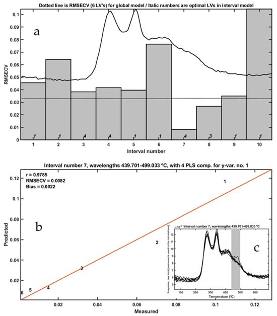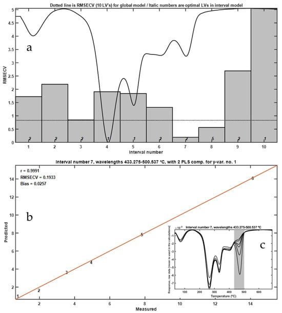DTG curves revealed a distinct peak corresponding to the thermal degradation of LLDPE, with a maximum at 472 °C (Figure 6). This peak was well separated from the broader degradation events associated with the frass matrix (Figure 6a), which occurred at lower temperatures. Application of interval partial least squares (iPLS) regression to the DTG data enabled the identification of the most predictive thermal regions for quantifying LLDPE content. The most informative temperature interval was 433.27–500.54 °C, which corresponds precisely to the onset and peak of LLDPE decomposition (Figure 6c).