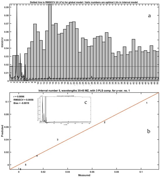 The Interval Partial Least Squares (iPLS) algorithm was selected as the primary variable selection strategy due to its proven efficacy in handling multivariate spectral datasets—particularly those exhibiting high collinearity, localized informative features, and significant background interference, as is the case in our FTIR, DTG, and CP-MAS NMR data from Tenebrio molitor frass samples. Given that our objective was to quantify low-density polyethylene (LLDPE) content in a complex biological matrix (partially digested oatmeal and insect excretions), it was critical to isolate spectral regions specifically associated with LLDPE’s chemical signature (e.g., aliphatic C–H stretches in FTIR, characteristic thermal degradation peaks in DTG, or methylene resonances in CP-MAS) while suppressing contributions from biogenic components. iPLS achieves this by systematically evaluating the predictive performance of PLS models built on contiguous spectral intervals, enabling both noise reduction and chemically meaningful feature selection [,,]. Unlike filter- or wrapper-based methods that may prioritize statistical performance over interpretability, iPLS preserves the link between selected variables and underlying physicochemical phenomena—a key requirement for environmental and biological applications. Furthermore, its implementation via the iToolbox ensures methodological transparency and reproducibility, aligning with best practices in chemometric modeling of spectroscopic data [,].