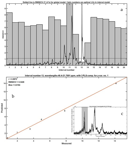 Chemometric analysis using interval partial least squares (iPLS) confirmed that the most predictive spectral region for LLDPE quantification was the aliphatic zone (10–45 ppm). The optimized model showed excellent linear correlation (R = 0.9972) with low cross-validation error (RMSECV = 0.3426), indicating robust predictive performance across the tested concentration range. The observed calibration performance highlights the technique’s potential not only for qualitative detection but also for precise quantification of microplastic residues in biological matrices.