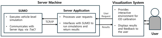 The architecture of our system is designed to support iterative, exploratory calibration of OD traffic flows while balancing computational efficiency and analytical flexibility. To achieve this, the system adopts a modular client–server architecture that separates simulation, estimation, data management, and visualization responsibilities (Figure 5).