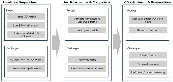 In the traffic simulation literature, the term “calibration” has often been used to denote the adjustment of microscopic driver behavior parameters, such as desired time headway, acceleration, or minimum gap, frequently accompanied by sensitivity analyses to identify the most influential parameters [9,13,14]. Such principles of traffic microsimulation calibration have been comprehensively discussed by Hollander and Liu [15], while the reliability and uncertainty of trajectory-based parameter calibration have also been critically examined [16]. In contrast, our study employs the term specifically in the context of OD flow calibration, where the objective is to adjust OD matrices so that simulated link flows match observed traffic counts. While behavioral parameter calibration and its associated sensitivity analysis play a vital role in microscopic model validation, they are beyond the scope of this study. Our contribution is focused on enhancing OD flow calibration through interactive visualization and analyst support.