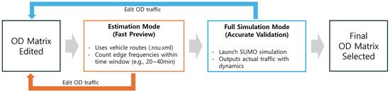 A dual-mode OD calibration method supported by our system. Users can iteratively refine the OD matrix using a fast, estimation-based preview or validate the results through a full SUMO simulation. The estimation mode enables quick feedback by counting edge (i.e., link) traversals from pre-generated vehicle routes, while the simulation mode captures dynamic traffic behaviors for final verification.