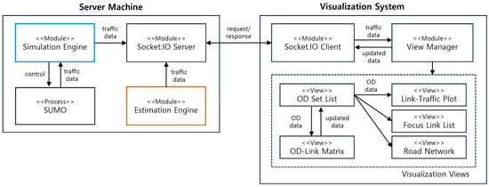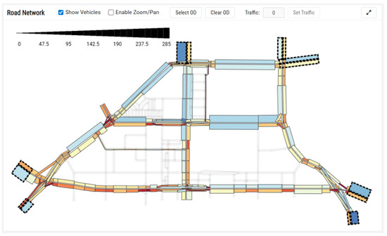 The system was implemented as a web-based client–server application. The server-side components were developed in Python (version 3.8), utilizing a Socket.IO server for real-time bidirectional communication. On the client side, we used the Angular framework for application logic and interface structure. Visualization components were implemented using a combination of HTML Canvas and D3.js [41], enabling interactive and high-performance rendering of traffic data. Communication between the server and client was handled via Socket.IO to support responsive, event-driven updates. For traffic simulation, we integrated SUMO, version 1.21, which provided the simulation engine for generating link-level traffic volumes based on the input OD matrices.