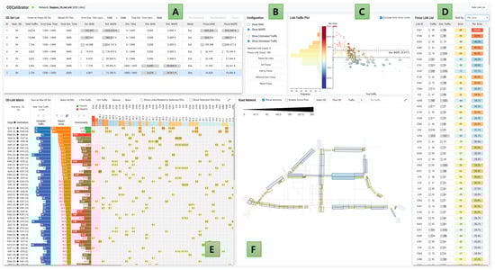 The main interface of ODCalibrator consists of six coordinated views: (A) OD Set List that tracks calibration iterations and associated error metrics; (B) configuration panel that allows switching between estimation and simulation modes and managing focus sets; (C) Link-Traffic Plot that visualizes link-level error distributions; (D) focus link list that displays detailed metrics for individual links in a ranked list; (E) OD-Link Matrix that supports OD-to-link reasoning and interactive OD value editing; and (F) road network view that provides a spatial overview of traffic patterns and mismatches.