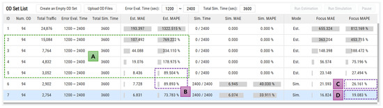 The OD Set List (Figure 7) displays all OD configurations generated throughout the calibration process in a structured, scrollable table. Each row corresponds to a complete OD set, which is a collection of OD pairs and their assigned traffic values. The table includes metadata such as the number of OD pairs, total traffic volume, and the associated evaluation time range, offering a compact summary of each calibration attempt.