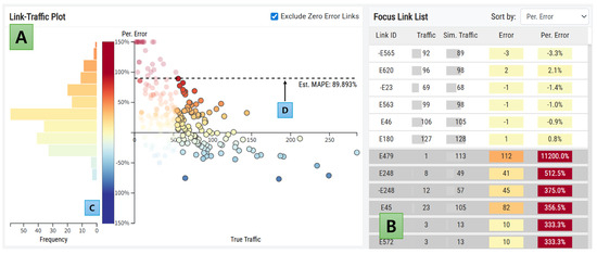 - Focus Links: A user-defined subset of links that reflect the analyst’s domain-specific interests—such as critical intersections, arterial roads, or areas involved in active planning. While network-wide error patterns are useful for global assessment, calibration efforts often concentrate on these high-priority segments. Focus links enable localized error evaluation and targeted refinement, allowing users to restrict metrics and analysis to the parts of the network most relevant to their goals.