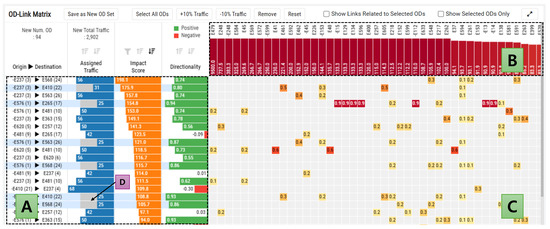 Various traffic simulation platforms, such as Simulation of Urban Mobility (SUMO) [8,9], PTV VISSIM [10], MATSim [11], and TRANSIMS [12], provide analysts with the ability to model urban mobility and obtain detailed link-level traffic outputs. While these tools are effective for generating and simulating traffic flows, their support for OD calibration workflows remains limited. They typically produce numerical outputs or static visualizations, offering little guidance on how individual OD pairs contribute to link-level mismatches or how local adjustments affect the broader network. As a result, analysts often rely on time-consuming trial-and-error processes without sufficient interactive support.