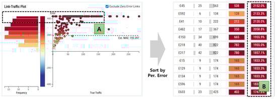In the Link-Traffic Plot, she observes that the histogram shows a strong concentration of links near the upper end of the error axis, with many points forming a dense cluster around the maximum positive error range (Figure 12A). This indicates that the current OD matrix substantially overestimates traffic on multiple links, resulting in extreme positive discrepancies across the network (Task 3). Jenny switches to the focus link list to inspect exact error values for the most problematic links. She sorts the links in descending order by percentage error and observes a highly skewed distribution, with many links exceeding 1000% (Figure 12B).