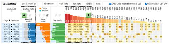 She then shifts to selective adjustments (Task 5). By sorting the OD-Link Matrix by impact score and directionality, she identifies OD pairs strongly associated with overestimation and reduces their traffic (Figure 11). The result is mixed: the MAE decreases from 8.4 to 7.7, but the MAPE rises slightly from 89.5% to 89.8% (Figure 7B), a consequence of low-volume links where small differences inflate percentage errors.